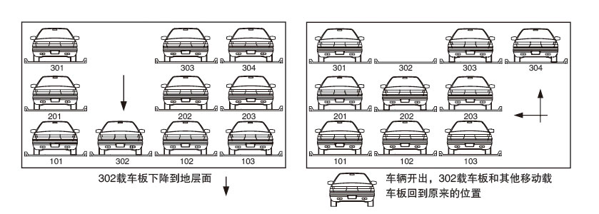 頂層車板上下升降,底層車扳左右水平橫移,中間層車板既可左右橫移叉可上下升降,通過不斷交換空位,完成車輛存取。