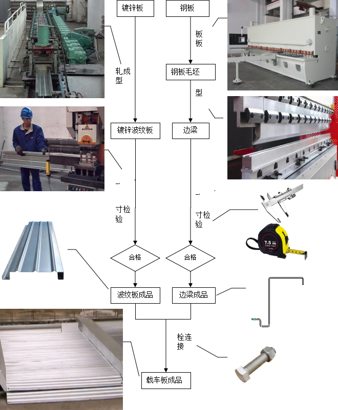 車臺板是通過鍍鋅波紋板和兩側(cè)邊梁通過螺栓連接而成,加工工藝如下圖。